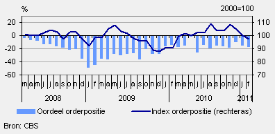 De orderontvangst liet in de periode november 2010 tot en met januari 2011 een positieve ontwikkeling zien. De ondernemers zagen tevens hun productie toenemen. Gelet op de grotere toename van de productie dan de orderontvangst, nam de omvang van de werkvoorraad af. Hierdoor daalde de aan de orderportefeuille gerelateerde index orderpositie naar 97,4 (juli 2000=100). Het is voor het eerst sinds maart 2010 dat de index onder de 100-grens is gekomen.
