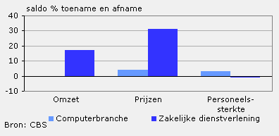 De omzet van de computerbranche nam in het vierde kwartaal van afgelopen jaar met bijna 3 procent toe ten opzichte van een jaar eerder. De vraag naar ICT diensten blijft aantrekken: de computerbranche doet het al twee kwartalen beter dan de zakelijke dienstverlening in zijn geheel. Daar was de omzet in het vierde kwartaal ruim 0,5 procent hoger.