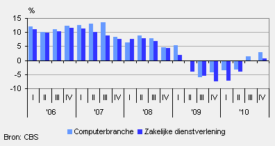 De computerservicebedrijven hebben in het vierde kwartaal van 2010 een omzetgroei behaald in vergelijking met het laatste kwartaal van 2009. Ten opzichte van het voorgaande kwartaal is de groei zelfs twee keer zo sterk. Uit de conjunctuurtest van januari 2011 blijkt dat het oordeel over het economische klimaat nagenoeg gelijk was aan het voorgaande kwartaal. Per saldo verwachten de ondernemers voor de komende periode een gelijkblijvende omzet. Zij verwachten wel een stijging van de prijzen en een groei van het personeelsbestand in hun branche.