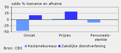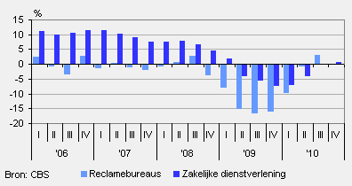 De reclamebranche liet in het laatste kwartaal van 2010 nagenoeg geen daling of stijging van de omzet zien. De ondernemers in de reclamebranche zijn somber gestemd over het economische klimaat. Voor het eerste kwartaal van 2011 verwachten zij een daling van de omzet en de werkgelegenheid.
