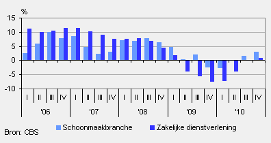 De schoonmakers hebben in het vierde kwartaal van vorig jaar 3 procent meer omgezet dan een jaar eerder. De omzettoename was voor een derde het gevolg van een hogere afzetprijs. De volumegroei van de schoonmaakbranche bedroeg in het vierde kwartaal 2 procent. In vergelijking met de andere zakelijke dienstverleners deden de schoonmakers betere zaken. De omzetgroei van de zakelijke dienstverlening als geheel beperkte zich tot ruim 0,5 procent ten opzichte van het laatste kwartaal het jaar ervoor. Over heel 2010 heeft de schoonmaakbranche 0,5 procent meer omgezet. De toename kwam volledig voor rekening van een hogere afzetprijs.