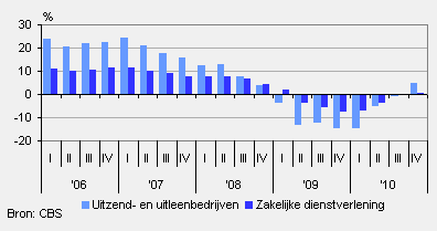 De uitzend- en uitleenbedrijven hebben in het vierde kwartaal van 2010, na zeven kwartalen van krimp, bijna 5 procent meer omgezet dan in hetzelfde kwartaal een jaar eerder. Door de toegenomen vraag naar uitzendkrachten (fase A) nam de omzet van uitzendbedrijven toe. De omzet van de uitzendbedrijven was 7 procent hoger dan een jaar eerder. Over heel 2010 nam de omzet van de uitzend- en uitleenbedrijven af met 4 procent. Deze afname was minder fors dan die van ruim 11 procent in 2009.