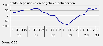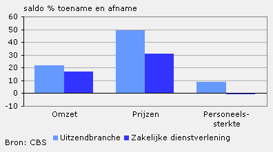 De ondernemers in de uitzendbranche zijn positief gestemd over hun verwachtingen voor het eerste kwartaal van 2011. Per saldo verwacht een op de vijf ondernemers een toename van de omzet. Ook verwacht per saldo de helft hogere prijzen. Daarmee zijn de ondernemers in de uitzendbranche positiever in hun verwachtingen over het eerste kwartaal 2011 dan de totale zakelijke dienstverlening.