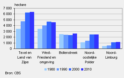 In de periode 1980-2010 groeide het bloembollenareaal met 8,9 duizend hectare (62 procent). Rond Den Helder nam het areaal toe met 2,9 duizend hectare (85 procent) en in West-Friesland met 1,1 duizend hectare (32 procent). In de Bollenstreek steeg de oppervlakte met maar 90 hectare (3 procent). De grootste groei van het bloembollenareaal was in de jaren 1990-2000. Het totale areaal nam in die jaren toe met 6,2 duizend hectare (38 procent). In de afgelopen tien jaren (2000-2010) was de groei van het totale bloembollenareaal maar 730 hectare (3 procent). In West-Friesland en omgeving nam het areaal met drie procent licht af.