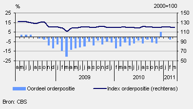 In de periode december 2010 tot en met februari 2011 is de orderontvangst volgens de ondernemers verder teruggelopen. Hierdoor daalde de werkvoorraad licht. De index van de orderpositie, waarin de omvang van de orderportefeuille tot uitdrukking komt, zakte 0,4 punt en kwam uit op 119,5 (juli 2000=100).