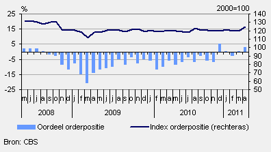 Het oordeel over de werkvoorraad is verbeterd ten opzichte van maart, per saldo wordt positief geoordeeld over de orderpositie. In april is het aantal gunstig gestemden in de meerderheid. De index van de orderpositie is daardoor gestegen en komt uit op 124,3 (juli 2000=100).