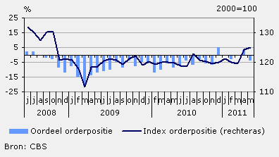 In de periode februari tot en met april is de orderontvangst toegenomen. De productie is in dezelfde periode eveneens gestegen. De index van de orderpositie is hierdoor licht toegenomen en komt uit op 125,1 (juli 2000=100). Desondanks oordelen de ondernemers negatief over hun orderpositie.