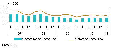 In het eerste kwartaal van 2011 ontstonden 14 duizend nieuwe vacatures. Dit zijn er duizend meer dan in hetzelfde kwartaal van vorig jaar. Het aantal vervulde vacatures kwam uit op 12 duizend. Aan het eind van het eerste kwartaal bedroeg het aantal openstaande vacatures 9 100. In vergelijking met het eerste kwartaal van 2010 steeg het aantal openstaande vacatures met bijna een kwart. Het aantal vacatures ligt nog wel lager dan in de jaren 2007-2008.