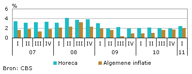 Alle branches in de horeca haalden in het eerste kwartaal van 2011 meer omzet dan een jaar eerder. De cafetaria’s boekten de grootste omzetgroei. Hun omzet was bijna 8 procent hoger dan een jaar eerder. Deze groei is vooral toe te schrijven aan een hoger volume. Het volume was 5 procent hoger dan in het eerste kwartaal van 2010. De prijzen waren 2,5 procent hoger dan een jaar eerder.