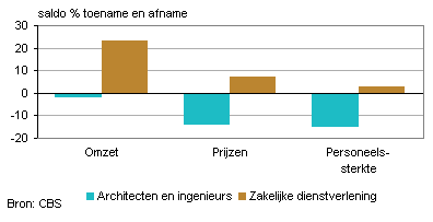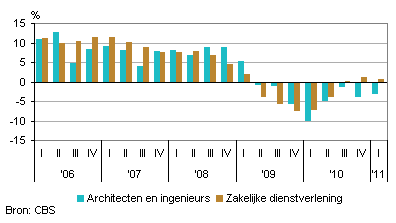 Voor de achtste keer op rij kromp de omzet van de architecten- en ingenieursbureaus vergeleken met hetzelfde kwartaal een jaar eerder. De omzetdaling in het eerste kwartaal van 2011 bedroeg 3,2 procent. De omzetontwikkeling van deze branche liep daarmee niet parallel aan die van de totale zakelijke dienstverlening. Daarin werd in het eerste kwartaal van 2011 namelijk 0,7 procent meer omzet behaald.