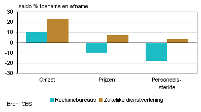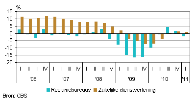 De reclamebranche zag in het eerste kwartaal van 2011 de omzet met 1,5 procent dalen vergeleken met een jaar eerder. Hiermee komt de omzet van deze branche op het laagste niveau sinds de start van de reeks. De negatieve ontwikkeling loopt niet in de pas met de ontwikkeling van de zakelijke dienstverlening in zijn geheel, die 0,7 procent meer omzet behaalde. Ondernemers verwachten in het volgende kwartaal enig herstel van de omzet.