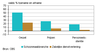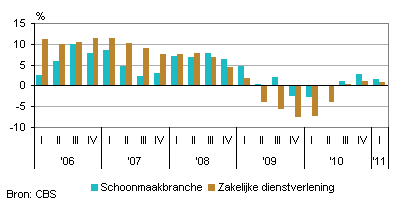 In het eerste kwartaal van 2011 hebben de schoonmakers 1,7 procent meer omzet behaald dan in hetzelfde kwartaal van vorig jaar. De hogere omzet kwam vooral voor rekening van de hogere afzetprijzen, want het omzetvolume bleef vrijwel gelijk. In de schoonmaakbranche was de groei van de omzet groter dan bij de zakelijke dienstverlening als geheel. Daar werd in dezelfde periode 0,7 procent meer omgezet. De omzetontwikkeling in de schoonmaakbranche is al elf kwartalen hoger dan in de zakelijke dienstverlening.