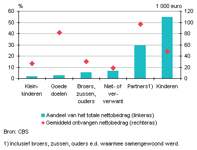 Vooral familieleden profiteren van erfenissen. Ruim de helft van het totale bedrag aan erfenissen kwam bij kinderen van de overledenen terecht. Gemiddeld kregen ze 48 duizend euro. Daarnaast ging bijna 30 procent naar achtergebleven partners. Zij ontvingen met 97 duizend euro gemiddeld het grootste bedrag, gevolgd door de goede doelen.