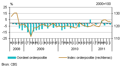 In de periode van april tot en met juni zijn er minder orders ontvangen dan in de voorgaande drie maanden. Doordat ook de productie afnam, bleef de werkvoorraad nagenoeg ongewijzigd. De index orderpositie kwam uit op 123,5 (juli 2000=100). Per saldo vindt 3 procent van de ondernemers dat hun orderpositie te klein is en 6 procent is van mening dat de voorraden gereed product te groot zijn, gelet op de afzetverwachting.