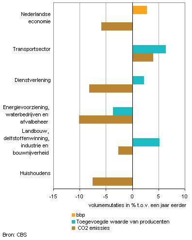 De transportsector is in het eerste kwartaal van 2011 behoorlijk opgeveerd. De toename van de toegevoegde waarde in de transportsector was iets groter dan 6 procent. De uitstoot van CO2 is ook gestegen, namelijk met 4 procent, door de extra vervoersbewegingen. Vooral de binnenvaart en het vervoer over de weg hebben door de intensivering van vervoersbewegingen substantieel meer CO2 uitgestoten. Ook de luchtvaart heeft meer uitgestoten doordat er meer is gevlogen dan een jaar eerder.