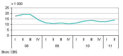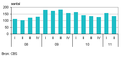 In het tweede kwartaal werden 133 faillissementen uitgesproken in de detailhandel. Dit aantal ligt redelijk in lijn met het aantal in de laatste drie kwartalen van 2010. In vergelijking met het eerste kwartaal van 2011 nam het aantal faillissementen wel duidelijk af. In dat kwartaal was er sprake van een piekje in het aantal bedrijven dat faillissement moest aanvragen. Het aantal faillissementen lag in het tweede kwartaal duidelijk lager dan in het crisisjaar 2009, maar nog wel duidelijk hoger dan vlak voor de crisis.