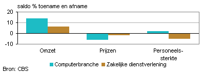 De omzet van de computerservicebedrijven groeide in het tweede kwartaal met 1,9 procent ten opzichte van een jaar eerder. Hiermee nam de vraag naar ICT-diensten voor de vierde keer op rij toe. De omzetgroei is minder groot dan in de zakelijke dienstverlening als geheel. Daarin was de omzet in het tweede kwartaal 3,3 procent meer dan een jaar eerder.