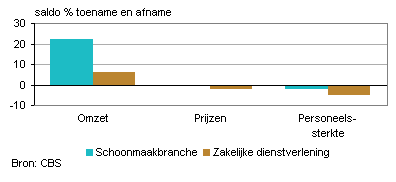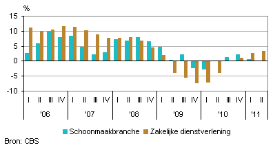 In de schoonmaakbranche is de omzet in het tweede kwartaal van 2011 met 0,2 procent gegroeid in vergelijking met de omzet in hetzelfde kwartaal een jaar eerder. Deze omzetgroei werd gerealiseerd met afzetprijzen die 1,8 procent hoger lagen dan in het tweede kwartaal van vorig jaar. De schoonmakers deden het in de eerste helft van 2011 slechter dan de andere zakelijke dienstverleners. De zakelijke dienstverlening als geheel zette 3,3 procent meer om dan een jaar eerder.