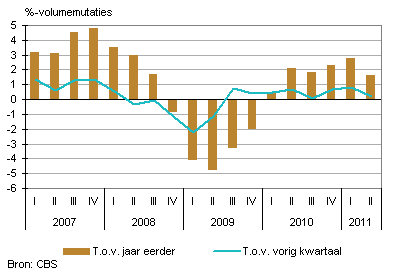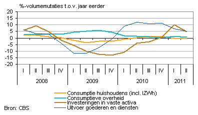 Sinds de opleving na de crisis vormt de uitvoer de motor van de economie. In het eerste kwartaal kwam daar het aantrekken van de investeringen nog bij. In het tweede kwartaal bleef de totale uitvoer weliswaar fors groeien, maar nam het groeitempo van de uitvoer van Nederlandse goederen wat af. Juist deze uitvoer is van groot belang voor de Nederlandse economie. Een ander verschil met het eerste kwartaal is dat de groei van de investeringen sterk afnam. De investeringen stegen met 4,8 procent, tegen 10,1 procent in het eerste kwartaal. De terugval van de investeringsgroei hangt samen met de bouw van woningen en bedrijfsgebouwen. In het eerste kwartaal kreeg deze een extra stimulans door het weer, dat veel milder was dan een jaar eerder. In het tweede kwartaal was van een dergelijke stimulans geen sprake meer, zodat de groei terugliep. De investeringen in transportmiddelen en machines bleven in het tweede kwartaal wel stevig toenemen.