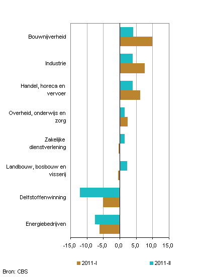 De productie van de delfstoffenwinning kromp in het tweede kwartaal met 12,1 procent ten opzichte van een jaar eerder. In het eerste kwartaal van 2011 was de delfstoffenwinning al met 5 procent gekrompen. De verklaring voor de twee kwartalen van krimp is dat de wintermaanden (inclusief april) in 2011 veel minder koud waren dan in 2010. Ook werd er minder aardgas uitgevoerd.