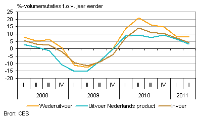 In het tweede kwartaal van 2011 was de uitvoer van goederen en diensten 5,3 procent hoger dan een jaar eerder. De wederuitvoer groeide stevig, de groei van de uitvoer van diensten bleef op peil, maar de uitvoergroei uit Nederlandse productie viel sterk terug. De invoer van goederen en diensten steeg met 4,4 procent.
