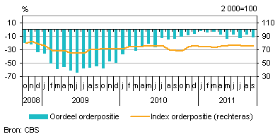 Volgens de ondernemers is in er in de periode juni tot en met augustus de orderontvangst afgenomen ten opzichte van de voorgaande drie maanden. De aan de werkvoorraad gerelateerde index orderpositie bleef op 74,5 (juli 2000=100) staan. Per saldo vindt ruim één op de acht ondernemers dat hun orderpositie te klein is en bijna één op de dertien van hen beoordeelt de voorraden gereed product als te groot.