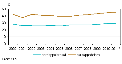 In de periode 2000-2005 daalde het aandeel aardappelteelt in de totale akkerbouw van 28 naar 26 procent. Daarna is het aandeel weer gestegen naar 30 procent in 2011. Een vergelijkbare ontwikkeling doet zich voor bij het aandeel aardappeltelers. In 2006 verbouwde nog 39 procent van de telers met akkerbouwgewassen aardappelen en in 2011 is dit ruim 45 procent.