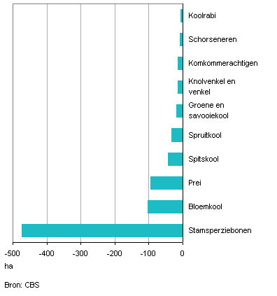 Van 2010 op 2011 is bij twee teelten het areaal meer dan 100 hectare gekrompen. Het areaal stamsperziebonen had met ruim 470 hectare (-17 procent) de grootste afname. Het areaal bloemkool volgde op afstand met een afname van ruim 100 hectare (-4 procent). De overige vollegrondsgroenten met een krimp hadden samen een areaalafname van 240 hectare.