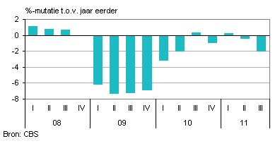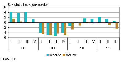 In het derde kwartaal van 2011 heeft de detailhandel 0,4 procent meer omgezet dan in dezelfde periode vorig jaar. De lichte groei kwam geheel door hogere prijzen (2,9 procent). Het volume van de verkopen kromp in het derde kwartaal met 2,5 procent. De krimp in het volume is in anderhalf jaar niet zo groot geweest. Vooral teruglopende verkopen bij non-foodwinkels drukten de ontwikkeling van de omzet en het volume.
