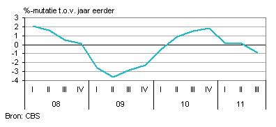 Huishoudens besteedden in het derde kwartaal 0,9 procent minder aan goederen en diensten dan een jaar eerder. In de eerste helft van 2011 was de groei van de binnenlandse consumptie al vrijwel tot stilstand gekomen. Door de terugval van de consumptie is ook de economische groei in ons land teruggelopen. De cijfers over de consumptieve bestedingen zijn gecorrigeerd voor prijsveranderingen.