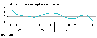 Vooral het vertrouwen in de economie liep de afgelopen maanden een deuk op. Deze deelindicator van het consumentenvertrouwen stond in september op -53, versus -16 in juni. In oktober en november verslechterde het vertrouwen nog verder. De koopbereidheid verminderde ook. Deze deelindicator ging van -8 in juni naar -14 in september. In oktober volgde een verdere daling, die in november weer werd goedgemaakt. De geringe koopbereidheid weerspiegelt zich in de ontwikkeling van de consumptieve bestedingen. Huishoudens gaven tot nu toe in 2011 minder uit aan goederen en diensten dan in dezelfde periode van 2010.