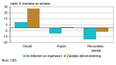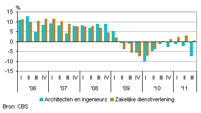 In het derde kwartaal van 2011 was de omzet van de architecten en ingenieurs aanzienlijk lager dan in hetzelfde kwartaal van 2010. De omzetdaling bedroeg 7,5 procent. Hiermee deed de branche het ook slechter dan in het eerste half jaar van 2011. De architecten- en ingenieursbureaus laten al tien kwartalen op rij een omzetdaling zien. Daarentegen was er voor de totale zakelijke dienstverlening voor de vijfde keer op rij sprake van een lichte omzetstijging. In het derde kwartaal nam hun omzet met 0,3 procent toe ten opzichte van een jaar eerder.