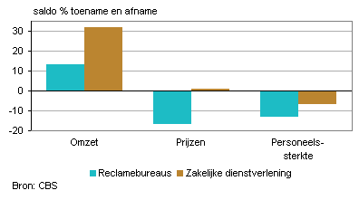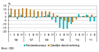De omzet van de reclamebranche lag in het derde kwartaal van 2011 onder het niveau van dezelfde periode een jaar eerder. In het tweede kwartaal van dit jaar was de daling van dezelfde orde van grootte. Uit de conjunctuurtest van oktober 2011 blijkt dat per saldo bijna één op de twee ondernemers in de reclamebranche het economische klimaat in het derde kwartaal zag verslechteren. Verder verwachten de reclamebedrijven lagere tarieven aan hun klanten in rekening te brengen en een verslechtering van de werkgelegenheid in hun branche.