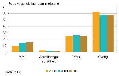 In 2010 kregen 128 duizend personen een bijstandsuitkering toegewezen. Dat zijn er 45 duizend meer dan in 2008. Ongeveer 17 procent van de mensen die in 2010 in de bijstand stroomden had in de maand daaraan voorafgaand een andere uitkering. Dit aandeel is met een derde toegenomen ten opzichte van 2008. Deze stijging komt vooral doordat er veel meer personen vanuit de WW in de bijstand kwamen.