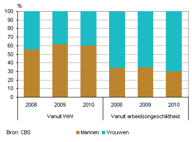 De doorstroom van WW naar bijstand bestaat voor een groot deel uit werkloze mannen van 25 tot 55 jaar. De sterkste toename in 2008-2010 vond echter plaats bij mannen tot 25 jaar. Bekend is dat deze groep vaak als eerste wordt getroffen bij economische teruggang. De doorstroom vanuit arbeidsongeschiktheid bestaat vooral uit vrouwen. In 2010 ging het bij ruim 70 procent van de totale doorstroom uit arbeidsongeschiktheid om vrouwen.