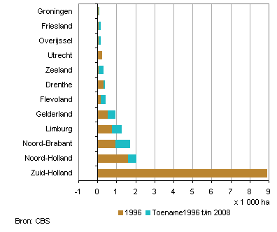 In de periode 1996-2008 heeft de glastuinbouw zich in rap tempo ontwikkeld. Het terrein voor glastuinbouw is van bijna 14 duizend hectare toegenomen tot bijna 17 duizend hectare, een toename van 20 procent. Ter vergelijking, het bebouwd terrein nam in die periode met 13 procent toe. Het meeste terrein voor glastuinbouw ligt in Zuid-Holland met bijna 9 duizend hectare, gevolgd door Noord-Holland met ruim 2 duizend hectare. De uitbreiding van het terrein voor glastuinbouw vond voornamelijk in Noord-Brabant plaats. In Zuid-Holland is er sprake van een toename in de gemeenten Lansingerland en Zuidplas en een afname in de gemeente Westland ten behoeve van het bebouwd terrein. Het doel van de provincie Zuid-Holland is het terugdringen van de verspreide kassen en het behoud van de oppervlakte glastuinbouw door het ontwikkelen van nieuwe glastuinbouwlocaties.