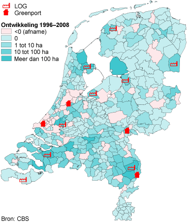 Het terrein voor glastuinbouw groeide tussen 1996 en 2008 sneller dan het bebouwd terrein. Er is in die twaalf jaar een glazen stad ter grootte van Haarlem bijgebouwd. Ruim de helft van het terrein voor glastuinbouw ligt in Zuid-Holland, maar het breidt zich daar nauwelijks uit. De grootste toename van de glastuinbouw was er in Noord-Brabant. Het telen van snijbloemen loopt terug, terwijl het telen van glasgroenten toeneemt. In de uitbreidingsgebieden worden voornamelijk glasgroenten geteeld.