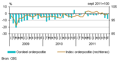 De ondernemers in de voedings- en genotmiddelenindustrie hebben in december een fractie meer orders in portefeuille dan in november. De index van de orderpositie, waarin de werkvoorraad tot uitdrukking komt, kwam uit op 99,8 (sept 2011=100) tegen 98,8 een maand eerder. Over de omvang van de orderportefeuille zijn de ondernemers negatief gestemd. Per saldo vindt 8 procent van hen dat er gezien de tijd van het jaar te weinig orders op de plank liggen.