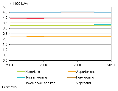 Tussen 2004 en 2010 was het gemiddeld jaarverbruik van elektriciteit in particuliere woningen redelijk stabiel. In 2010 was er over alle woningtypen gerekend een lichte stijging met 50 kilowattuur (kWh) naar gemiddeld 3 300 kWh. De toegenomen energie-efficiëntie van elektrische apparaten en verlichting wordt blijkbaar teniet gedaan door een toename in het gebruik van deze apparatuur. Het gas- en elektriciteitsverbruik per woning was het laagst in stedelijke gebieden.
