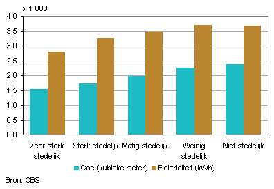 In stedelijke gebieden wordt gemiddeld minder gas en elektriciteit per woning verbruikt. Dit komt doordat er in steden meer appartementen staan en in niet-stedelijke gebieden meer vrijstaande woningen.