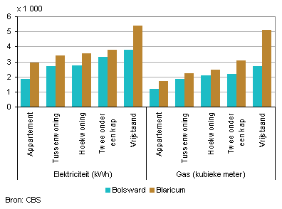 Ook tussen gemeenten met een vergelijkbare stedelijkheid komen grote verschillen in energieverbruik voor. Bolsward en Blaricum zijn beide weinig stedelijk, maar toch ligt het verbruik in Blaricum voor alle woningtypen fors hoger dan in Bolsward. Dit verschil is vooral zichtbaar bij vrijstaande woningen, die in Blaricum gemiddeld bijna twee keer zo veel gas verbruiken als in Bolsward en 40 procent meer elektriciteit. Blaricum is een van de gemeenten met de duurste huizen en staat bekend om zijn riante woningen.