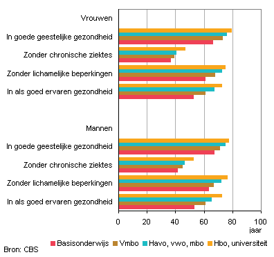 Hoogopgeleiden leven ook veel langer in goede gezondheid dan laagopgeleiden. Mensen met een hbo- of wo-opleiding leven bijna 20 jaar langer in een als goed ervaren gezondheid dan mensen met maximaal basisonderwijs. Bij de levensverwachting zonder chronische ziekten, zonder lichamelijke beperkingen en in goede geestelijke gezondheid zijn de verschillen iets kleiner, maar ook nog zo’n 10 tot 14 jaar.