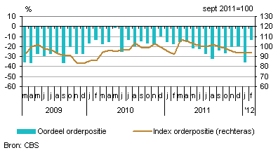 De orderontvangst is in de maanden november 2011 tot en met januari 2012 afgenomen volgens per saldo 9 procent van de ondernemers. De werkvoorraad is gekrompen ten opzichte van de vorige maand. De index orderpositie daalde naar 93,8. De ondernemers beoordelen hun orderportefeuille als te klein, gelet op de tijd van het jaar. Per saldo is 14 procent die mening toegedaan. Vanaf medio 2011 is dit oordeel wel steeds minder negatief geworden.