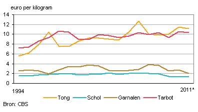 De prijs van aangevoerde garnalen daalde in 2011 met 25 procent ten opzichte van 2010 tot 2,03 euro per kilo. Sinds 1997 is de prijs niet zo laag geweest. Ook bij tong en tarbot daalde de prijs. Bij tong was de gemiddelde prijs bij de visafslagen 11,14 euro per kilo, een afname van 3 procent. De tarbot bracht 10,34 euro per kilo op voor de vissers, een afname van 2 procent. De schol deed het in 2011 iets beter dan in 2010. Met een stijging van 8 procent kwam de kiloprijs uit op 1,42 euro. Ondanks deze stijging blijft de scholprijs nog steeds laag.