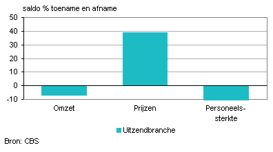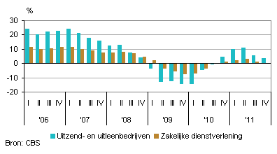 In het vierde kwartaal is de omzet van de uitzend- en uitleenbedrijven toegenomen vergeleken met dezelfde periode een jaar eerder. Wel vlakt de groei steeds verder af. Ondernemers in de uitzendbranche vinden dat het economische klimaat in het vierde kwartaal van 2011 verder is verslechterd. Dat blijkt uit de conjunctuurenquête van januari 2012. De vooruitzichten voor het eerste kwartaal van 2012 zijn eveneens somber. Bedrijven in deze branche verwachten een daling van de omzet en een afname van het personeelsbestand.
