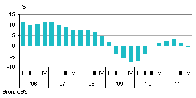 Na vijf achtereenvolgende kwartalen met groei is de omzet van de zakelijke dienstverleners in het vierde kwartaal van 2011 afgenomen. De afname was met 0,6 procent echter bescheiden vergeleken met het tweede kwartaal van 2009, toen de vorige periode van omzetdaling begon.