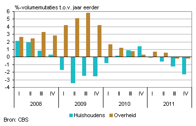 Het volume van de totale overheidsconsumptie is in het vierde kwartaal van 2011 met 0,2 procent gedaald ten opzichte van het overeenkomstige kwartaal een jaar eerder. De collectieve overheidsconsumptie daalde met 3,9 procent. Dit kwam voornamelijk doordat het aantal banen bij algemeen overheidsbestuur, politie en defensie verminderde. Ook kocht de overheid minder goederen en diensten in.