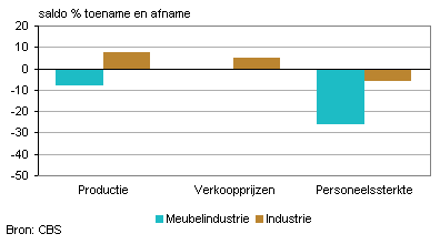 De Conjunctuurtest van maart 2012 laat een somber beeld zien van de meubelindustrie. Volgens de ondernemers is hun orderpositie ontoereikend. Per saldo verwacht ruim 8 procent van hen een afname van de productie in de komende drie maanden. Ruim een kwart verwacht dan ook een afname van de personeelssterkte in deze branche. De meubelindustrie maakt, in termen van omzet, slechts één procent uit van de totale industrie.