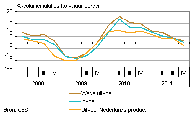 De uitvoer van Nederlandse goederen daalde met 2,6 procent ten opzichte van een jaar eerder. Hiermee kwam er een einde aan de groei van de voorgaande kwartalen in 2011. De wederuitvoer liet een geringe stijging zien van 0,8 procent. Het afnemende groeitempo van de wederuitvoer hangt samen met afnemende groei van de wereldhandel. Onder wederuitvoer vallen geïmporteerde goederen die na hooguit een kleine bewerking weer worden uitgevoerd. Voor de Nederlandse economie is uitvoer van Nederlandse producten belangrijker dan wederuitvoer.