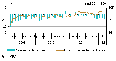 De ondernemers in deze branche oordelen nog negatiever dan een maand eerder over de omvang van hun orderportefeuille. Per saldo vindt bijna 8 procent van hen dat er gezien de tijd van het jaar onvoldoende orders in voorraad zijn. In februari was dit nog ruim 6 procent. Bijna drie procent van de bedrijven oordeelt ook negatief over de buitenlandse orderpositie.